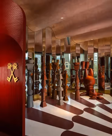 Cosy Box, Gurgaon, is a visual exploration of fluidity, from the flowing light formations to the curvaceous furniture and dynamic floor patterns. The absence of rigid geometry creates a seamless experience for patrons, further enriched by soft pastel tones. Glossy, reflective finishes elevate the mood, adding a touch of sophistication to the space.