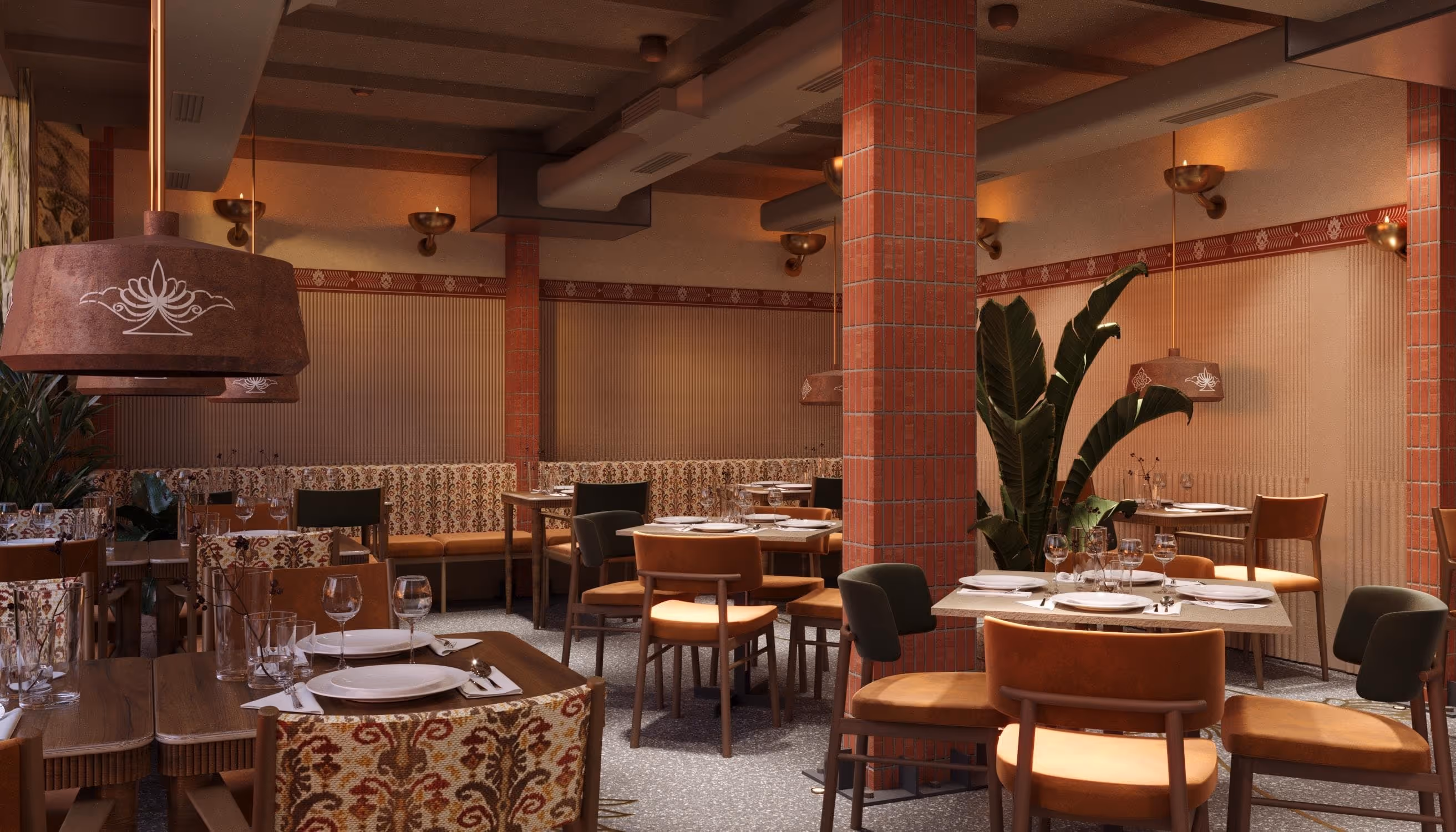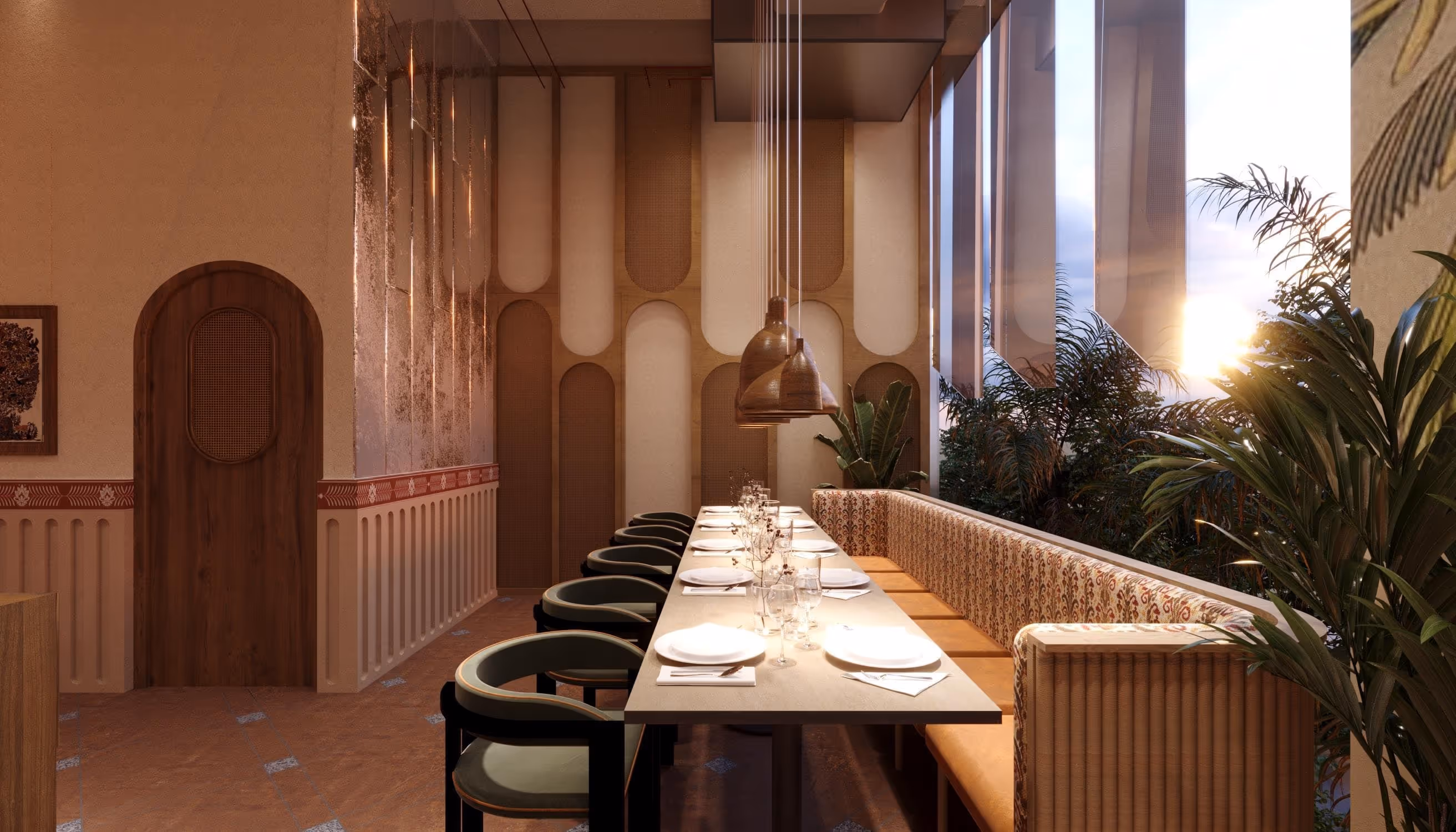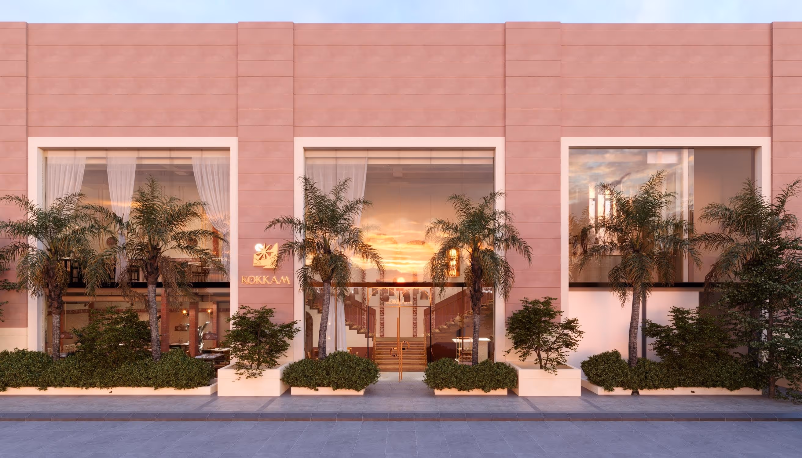 Kokkam was envisioned as a slice of Southern India, embracing the warmth and charm of traditional South Indian interiors. We chose an earthy color palette of rust, terracotta, and browns to evoke a sense of rootedness. Materials like brick, cement, and concrete feature prominently, both in the architecture and the decor. Richly patterned tiles, reminiscent of Southern Indian homes, add texture and vibrancy, while kolam patterns bring a cultural touch to wall details and light fixtures. To add a modern twist, these traditional elements are paired with contemporary furniture and touches of art deco in the bar and select lighting fixtures. Lush palms introduce greenery and freshness, and wallpapers inspired by Southern Indian motifs further enhance the restaurant’s theme.