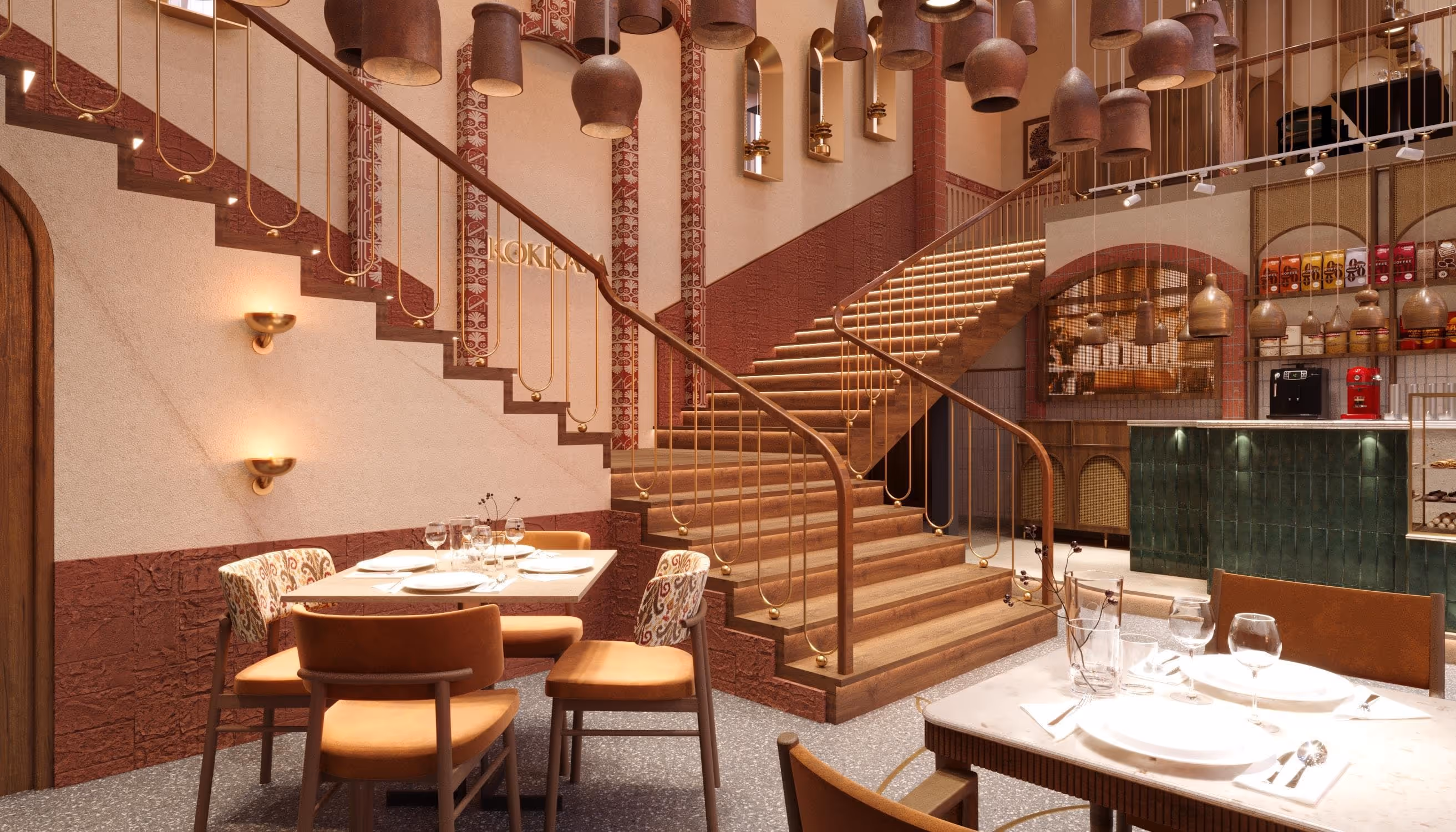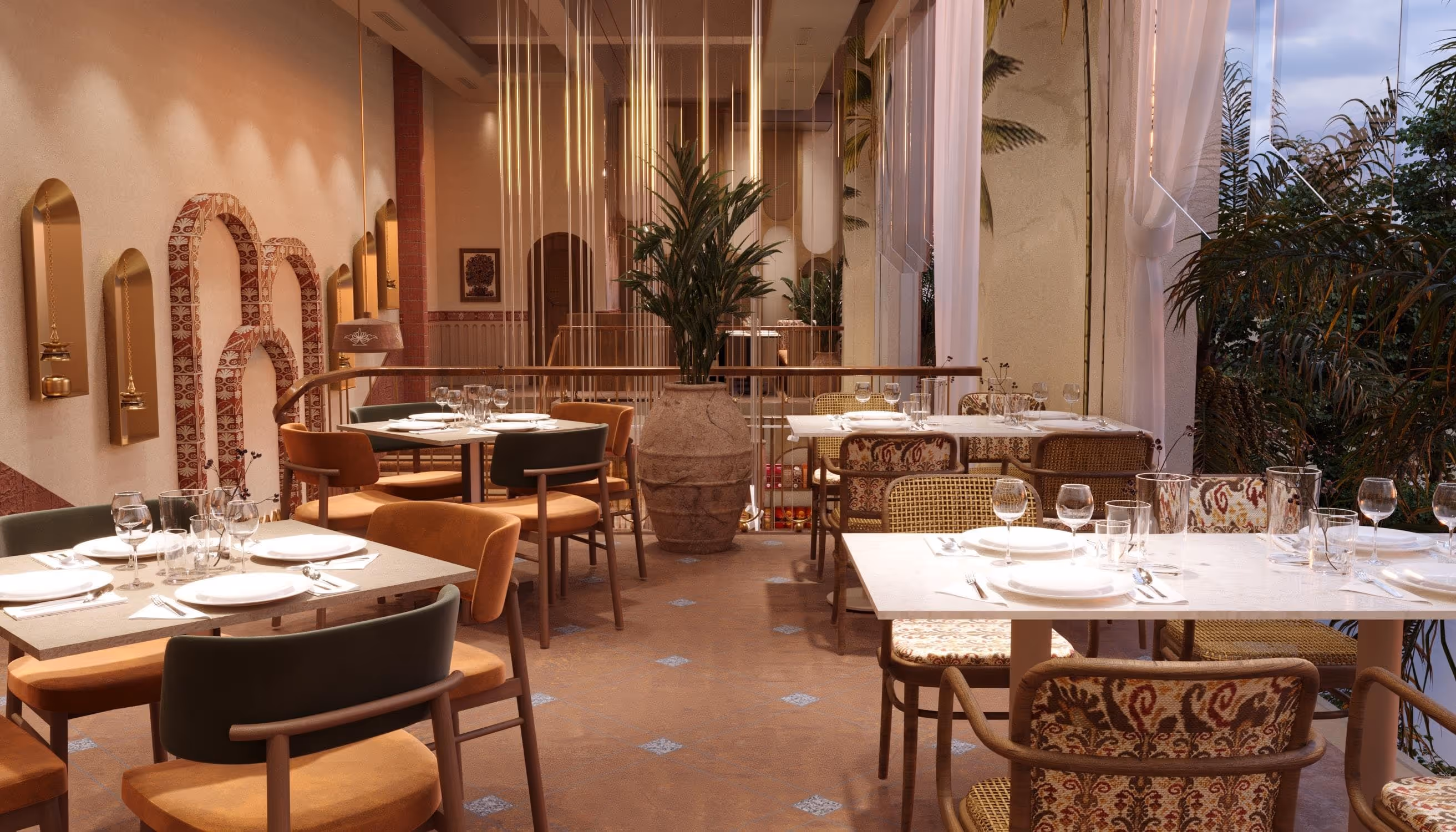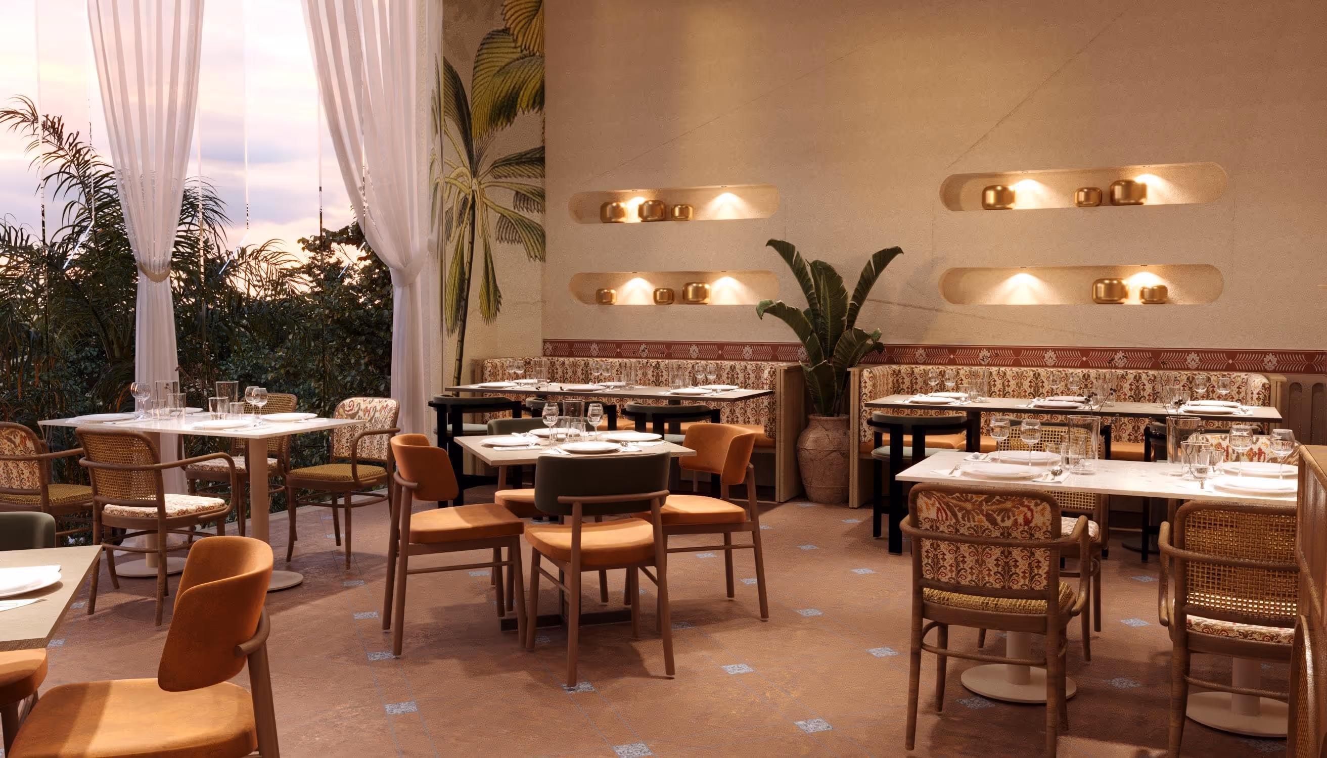 Kokkam was envisioned as a slice of Southern India, embracing the warmth and charm of traditional South Indian interiors. We chose an earthy color palette of rust, terracotta, and browns to evoke a sense of rootedness. Materials like brick, cement, and concrete feature prominently, both in the architecture and the decor. Richly patterned tiles, reminiscent of Southern Indian homes, add texture and vibrancy, while kolam patterns bring a cultural touch to wall details and light fixtures. To add a modern twist, these traditional elements are paired with contemporary furniture and touches of art deco in the bar and select lighting fixtures. Lush palms introduce greenery and freshness, and wallpapers inspired by Southern Indian motifs further enhance the restaurant’s theme.