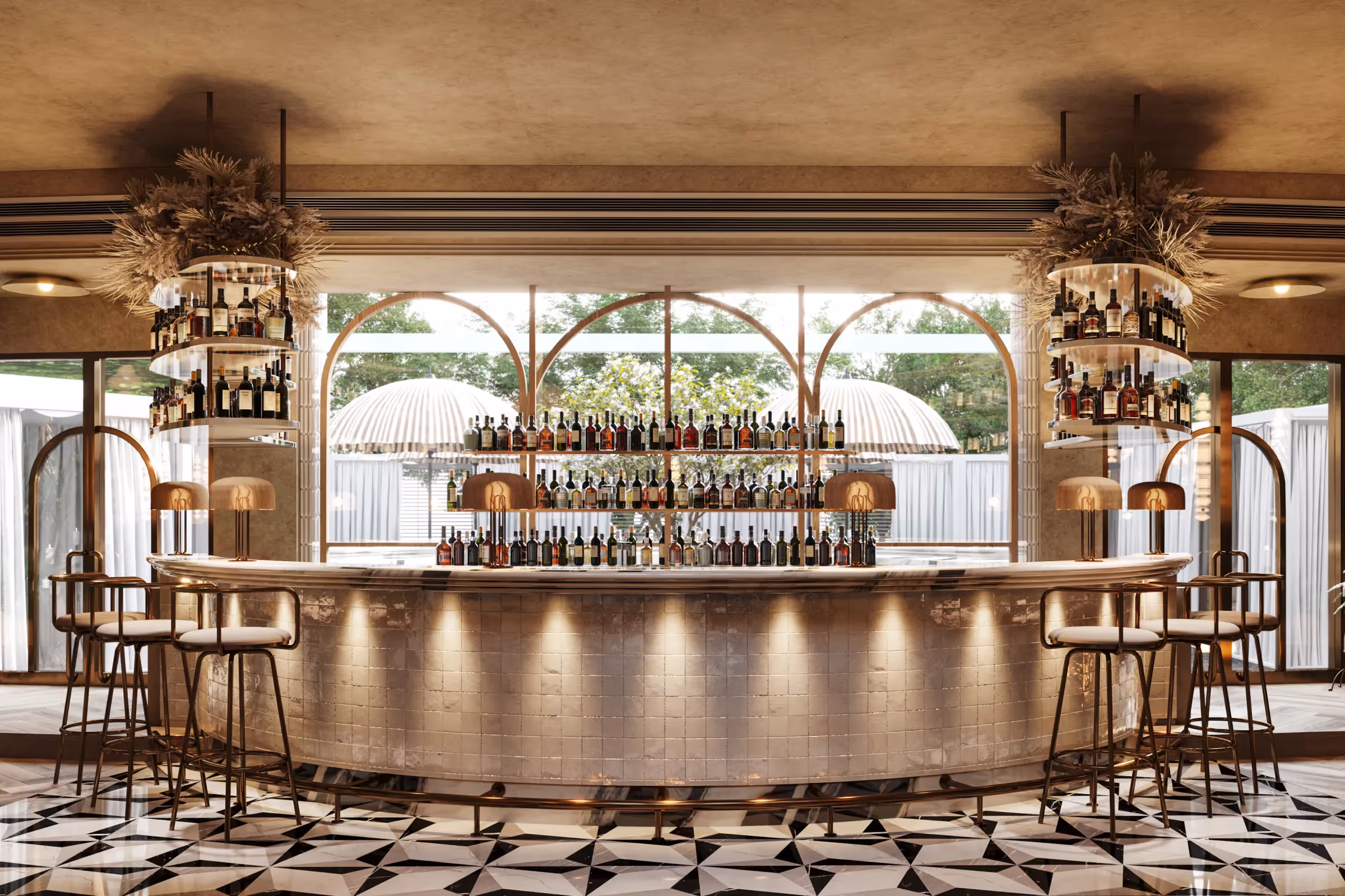 Ophelia was envisioned as a wild-boho retreat, embracing a raw aesthetic with a palette inspired by the untamed wilderness. The design features natural elements such as rope, travertine, wood, and rattan, creating an earthy and organic vibe. The space’s focal point is its striking chandeliers, which not only add grandeur but also define the theme, with fringes that evoke a jungle-like ambiance. Upholstery features a mix of animal prints and ikat patterns, balanced by muted leather tones for a subtle yet dynamic contrast. Elegance is infused through the thoughtful use of marble and brass, elevating the rustic charm to a sophisticated dining experience.